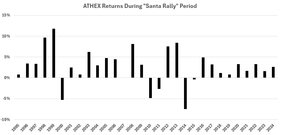 We looked at 30 years of data on the Athens General Index and found that this year-end into early January rally has been present in Greek markets as well. Out of 30 observations, Greek stocks were higher 25 times during this Santa Claus rally period, with an average gain of 2.6%.