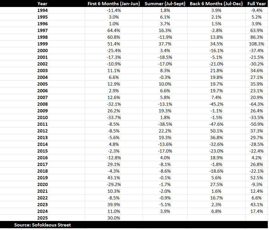 As mentioned, Greek stocks have had an impressive first half of the year with a gain of +30%. Historically, this is a good sign for the rest of the year. When the ATHEX gains more than 10% in the first half of a year, the average gain for the second half is 10.8%. This trend suggests that strong performance in the first half often sets the stage for a strong back half of the year.