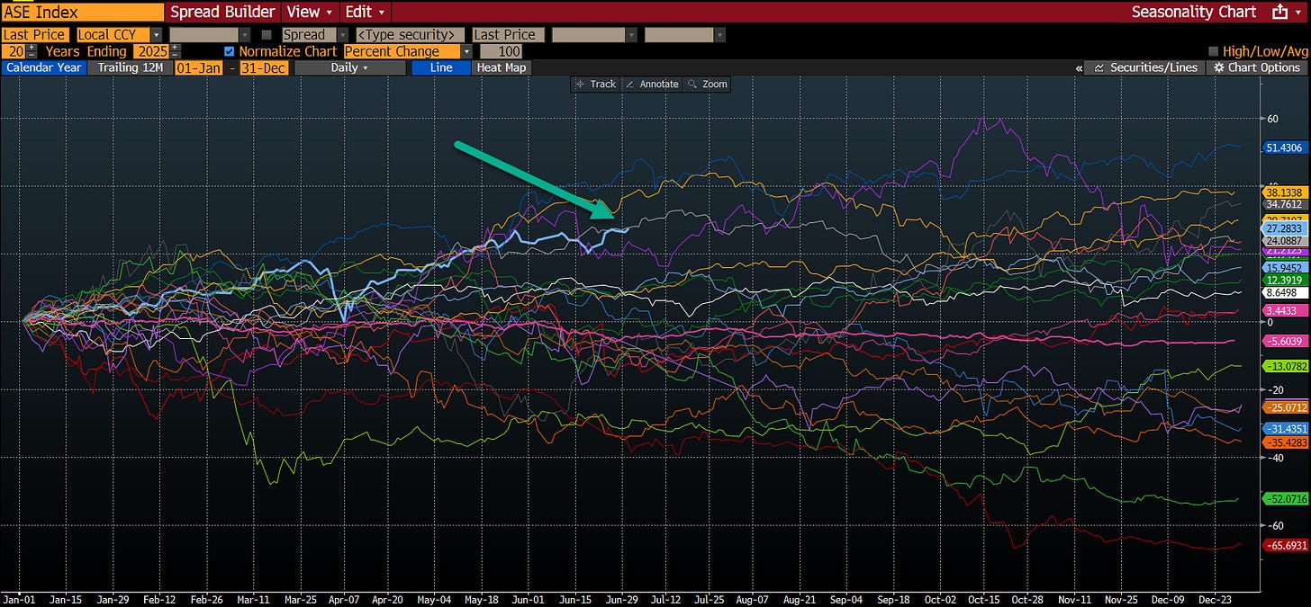 One comment on seasonality as it seems to be going out this window this year. June is historically the worst month for Greek stocks, but it was higher by over 3% this year. Symbolic that Greek markets are on such a tear they are brushing off all their old historical stigmas.