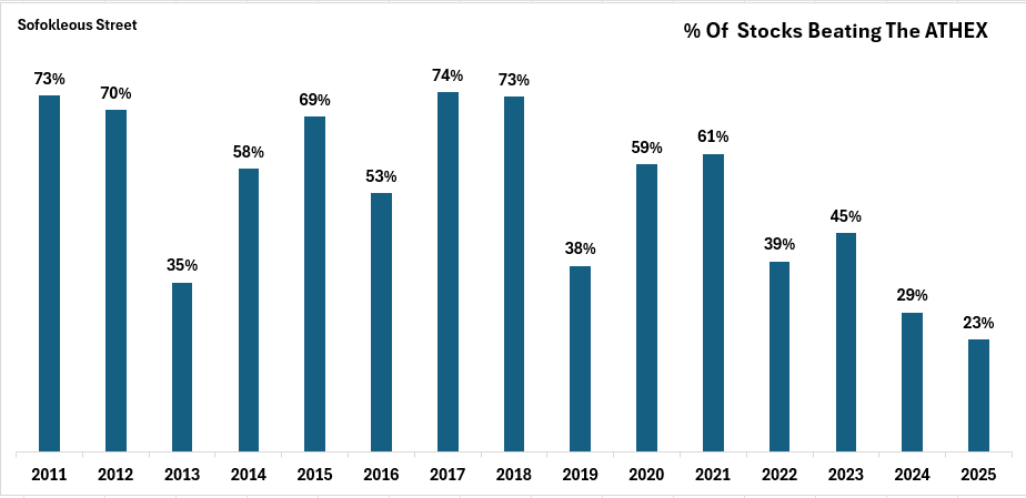 The Greek stock market isn’t that large, and the pool of stocks is shrinking. For example, the main Greek index is up over 50% this year, and most stocks are positive but only 23% are actually performing better than the index , a metric that’s been shrinking.