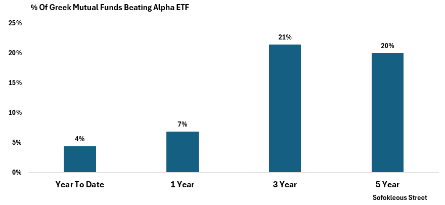 Looking across the 40+ Greek equity mutual funds, we checked returns over different horizons such year-to-date, 1-year, 3-year, and a longer 5-year. While long-term numbers look a bit better, the big picture is not good: only 20% of active funds beat a simple passive strategy like the Alpha FTSE Athex Large Cap ETF (AETF) over 5 years.